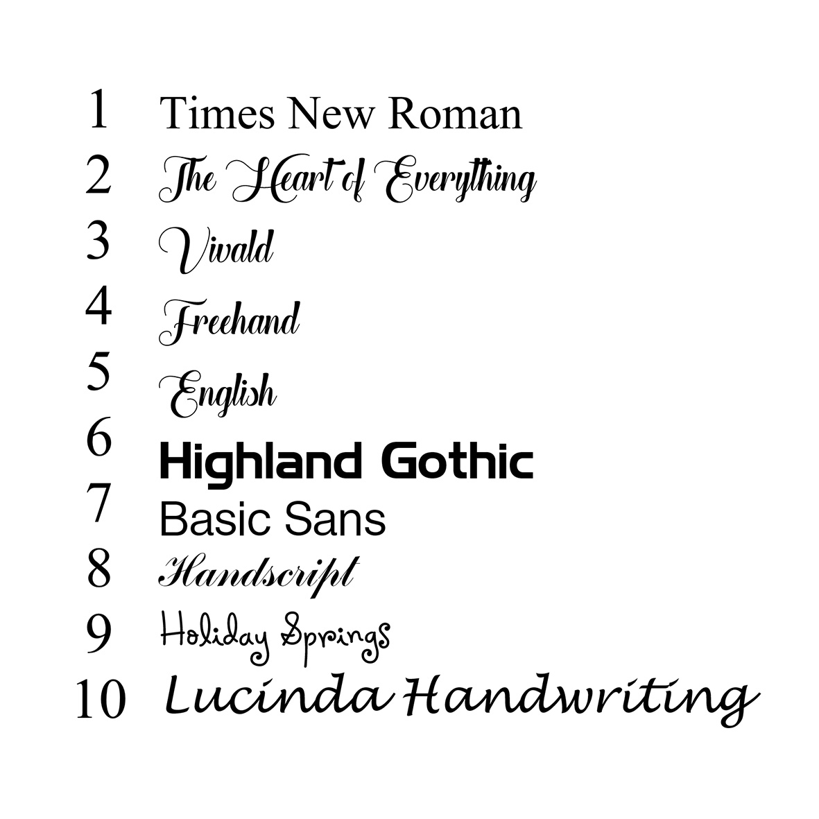 1. Times New Roman, 2. The Heart of Everything, 3. Vivald, 4. Freehand, 5. English, 6. Highland Gothic, 7. Basic Sans, 8. Handscript, 9. Holiday Springs, 10. Lucinda Handwriting
